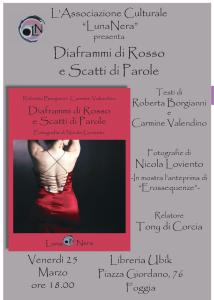 L’erotismo e la poesia, in una sintesi sospesa tra immagini e parole, fotografie e versi. Tre protagonisti, per un libro che mescola gli scatti di Nicola Loviento e i testi di Roberta Borgianni e Carmine Valendino, entrambi autori del volume Diaframmi di Rosso e Scatti di Parole.